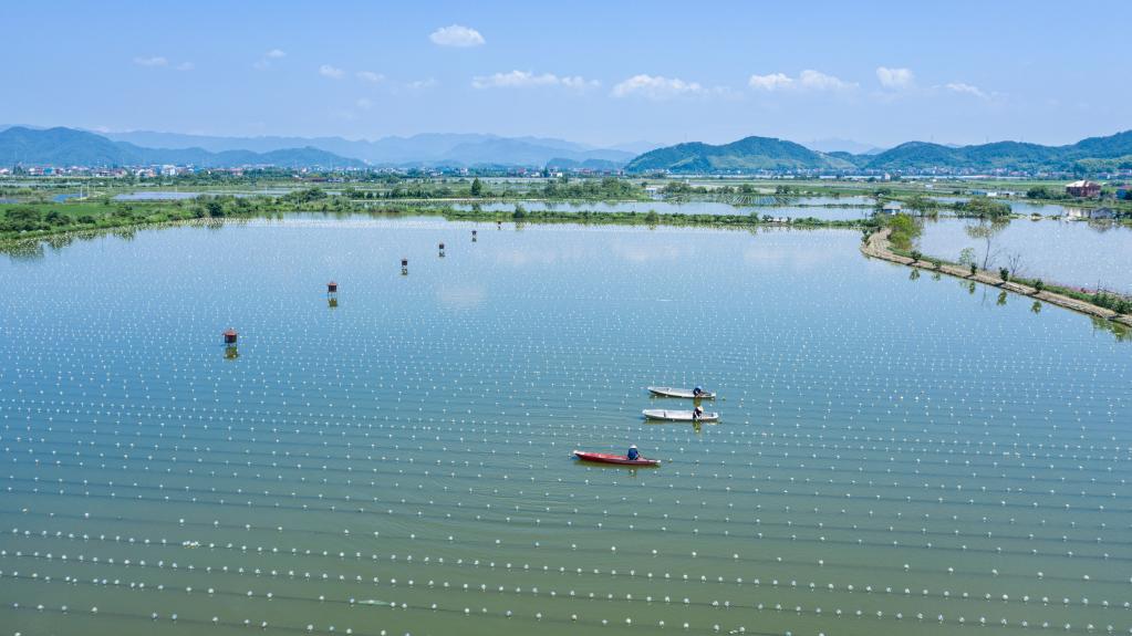 浙江清湖控股集团有限公司研发出“滴管”养殖珍珠蚌的方法。蚌塘内,工作人员正在检查蚌的生长情况。新华社发