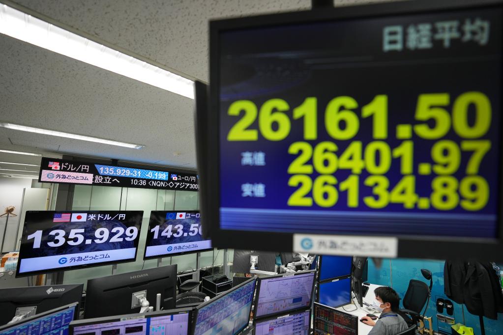 这是6月23日在日本东京一家外汇经纪公司拍摄的汇率显示屏(后)和股指显示屏。(新华社记者张笑宇摄)