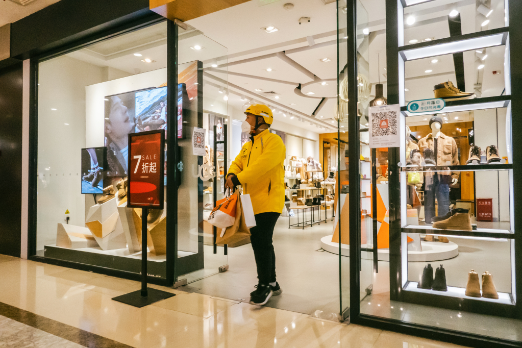 “双11”期间,一位跑腿小哥在商场中取货。(美团跑腿供图)