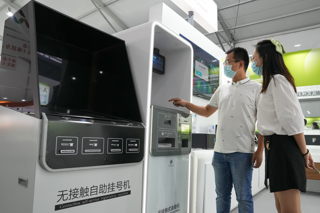 2022年9月15日,在2022年全国大众创业万众创新活动周合肥主会场的主题展区中,参展人员体验非接触式自助机。新华社记者 杜宇 摄