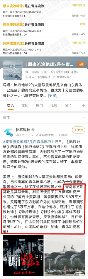 当天,关于 #原来流浪地球2是在青岛流浪# 的亮点话题登上微博热搜榜,引发了多家媒体及网友们热议。