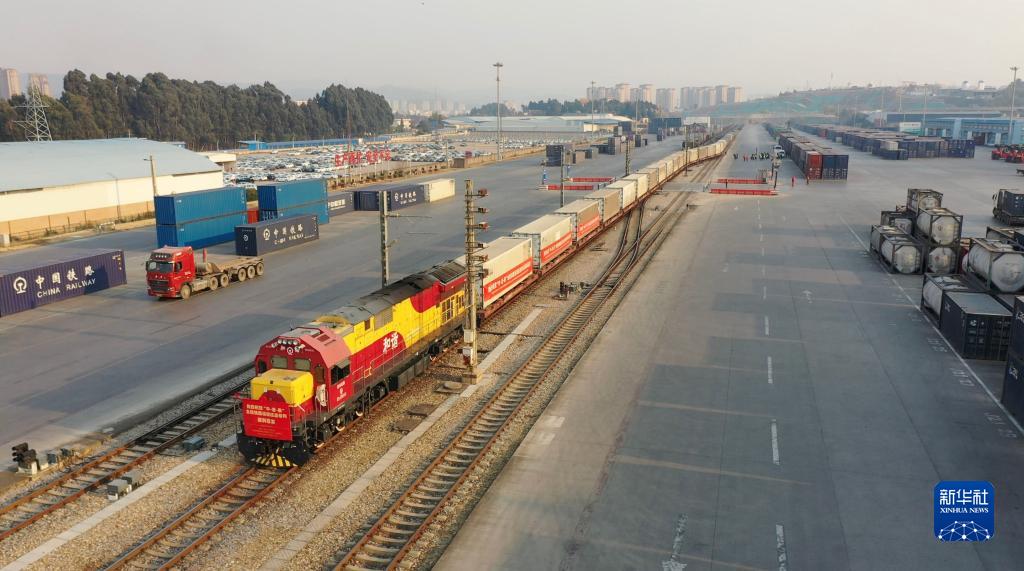 2月7日,“中老泰”全程铁路运输往返班列首发列车从云南省中铁联集昆明中心站驶出。新华社记者 丁怡全 摄