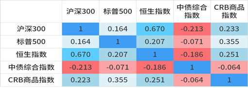 比如,债券类与股票类资产基本呈现低相关或负相关性。如下表所示,沪深300指数与中债综合指数相关系数为-0.213;恒生指数与中债综合指数相关系数为-0.186。这意味着,当股票类资产价格上涨或下跌时,债券类资产价格可能并不会随之涨跌,甚至还可能会反向变化。这样,在组合里同时配置股票、债券类资产,就可以一定程度上分散风险,降低组合的波动。