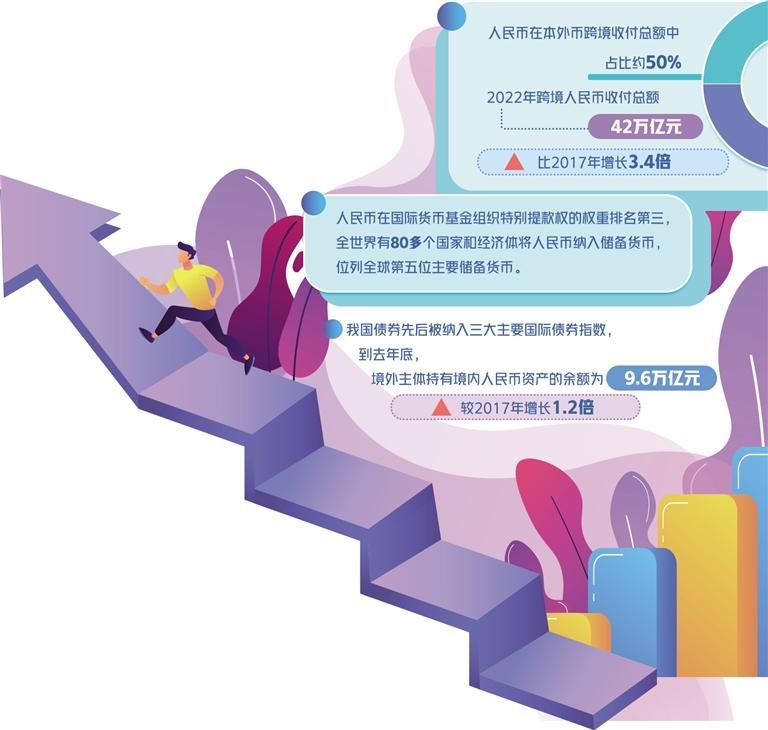 据潘功胜介绍,当前人民币国际化推进的成果表现在:一是人民币在本外币跨境收付总额中占了约50%,2022年跨境人民币收付总额是42万亿元,比2017年增长了3.4倍。