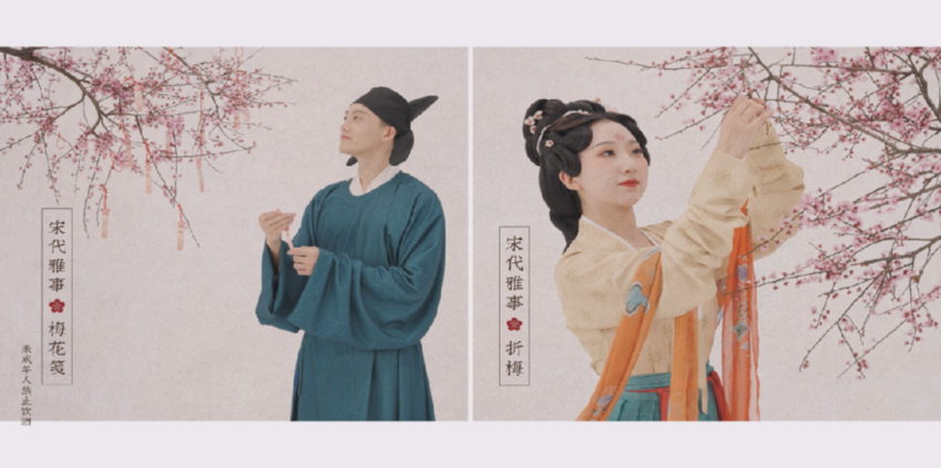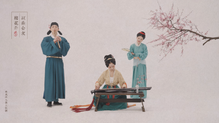从古至今,梅花就植根于中国文化的血脉之中,成为国人比德畅神的对象。东晋时期,更是以笛或萧来演奏《梅花三弄》,借物抒怀,感雅士之交。梅见将宋人与梅的故事具象为一个人物——李清照,二十四伎乐运用四种古乐器重新改编,当琴音响起,李清照和赵明诚的爱情故事便徐徐展开。
