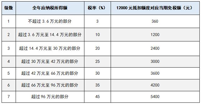 根据新政策测算,12000元的税前扣除额度对应当期免税额大约介于360元至5400元之间,具体如下表所示: