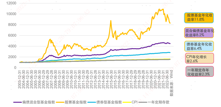 数据来源:Wind,时间区间为2003/12/31-2022/10/30,指数分别选择Wind股票型基金总指数(885012.WI)、Wind债券型基金指数(885005.WI)、Wind偏债混合型基金指数(885003.WI)进行测算;CPI使用当月环比数据;存款利率使用央行公示的一年期定期存款基准利率。以上数据以2003年12月作为基期、以1000作为基点,计算后续每个月的点位后制成折线图。