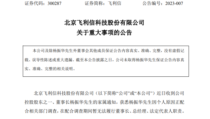 公告显示,飞利信近日收到公司控股股东之一、董事长杨振华家属通知,获悉杨振华因个人原因正配合相关部门调查,在配合调查期间暂无法履行董事长、总经理、法定代表人职责。