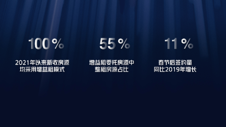 基于对企业质变的坚持与推进,自如的总规模虽然没太大变化,但资产组合发生了巨大的变化。据熊林介绍, 2021年以来自如新收业主委托房源均100%采用增益租模式,其中整租房源在自如委托房源中占比达到55%,今年春节后签约量同比2019年增长11%。而且增益租模式也已在自如集中式租赁产品中推行,实现多品类产品经营模式质变。