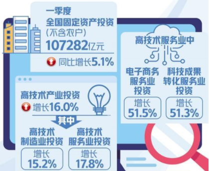 一季度,电子及通信设备制造业、医疗仪器设备及仪器仪表制造业投资,均实现了约20%的增长;与高技术制造业相比,高技术服务业投资增长更快,尤其是电子商务服务业、科技成果转化服务业等行业,投资增速均保持在50%以上。