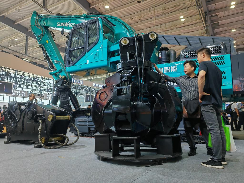 在山河智能装备股份有限公司的展区,一台40吨级的多功能挖掘机同样造型奇特:驾驶室高出底盘一大截,旁边摆放着粉碎钳、振动夯等各种各样的属具,如同“十八般兵器”。