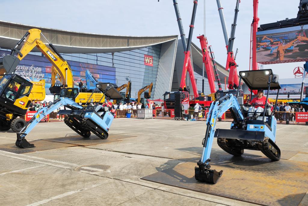 在三一重工的室外展区,蓝色涂装的电动化产品格外显眼。机手驾驶电动挖掘机和传统柴油挖掘机同场比拼“机械舞”,高难度动作引来观众阵阵欢呼,来自外地的采购商则对新产品的续航时间、充电方式颇感兴趣。