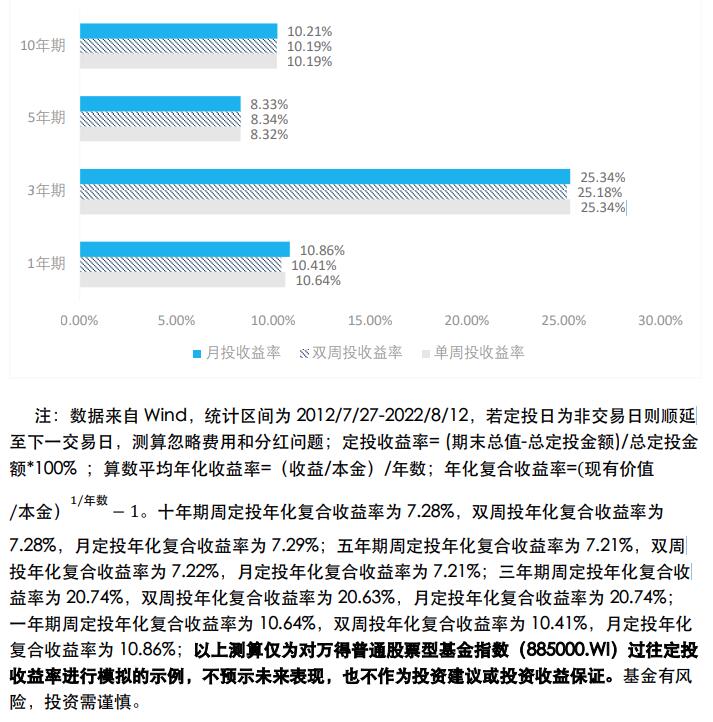 在设置好以上定投参数后,让我们看看在定投资金量一样的情况下,采用不同频率定投普通股票型基金指数(885000.WI)在 2012/07/27-2022/8/12 时间区间的收益情况: