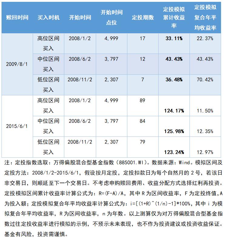 选取两个代表性时点:阶段性反弹高位区间(D点,2009年8月1日)和牛市高位区间(E点,2015年6月1日),作为定投终止时点;