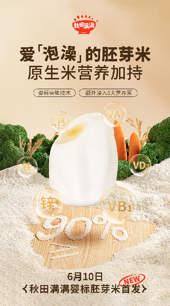 6月10日,辅食行业头部品牌秋田满满,发布了符合婴幼儿标准的胚芽米产品,受到市场关注。
