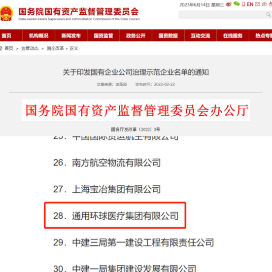 2022年环球医疗作为基层企业成功入选国务院国资委印发的《国有企业公司治理示范企业名单》