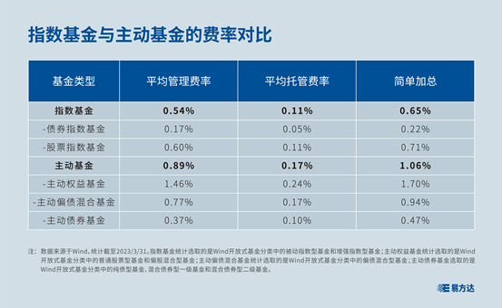 根据Wind数据,指数基金平均的管理费率和托管费率,分别为0.54%和0.11%,合计比主动基金低40BP左右。