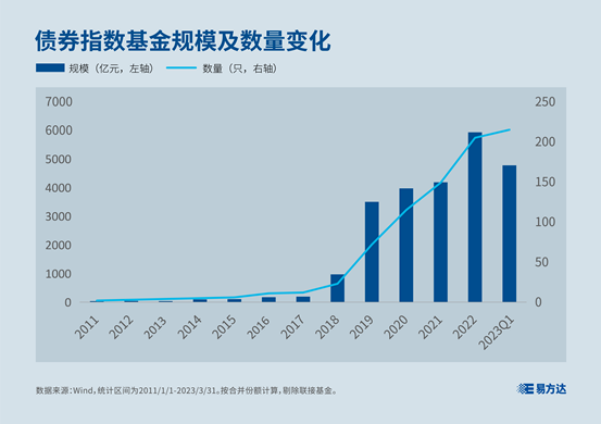 2018年之后,更多的基金管理人开始布局债券指数业务,债券指数基金的发展步入快车道。截至2023年3月31日,市场上已成立超200只债券指数基金,规模约5000亿元。