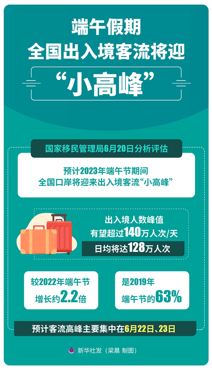 新华社北京6月20日电(记者任沁沁)国家移民管理局20日分析评估,预计2023年端午节期间全国口岸将迎来出入境客流“小高峰”,出入境人数峰值有望超过140万人次/天,日均将达128万人次,较去年端午节增长约2.2倍,是2019年端午节的63%,预计客流高峰主要集中在6月22日、23日。
