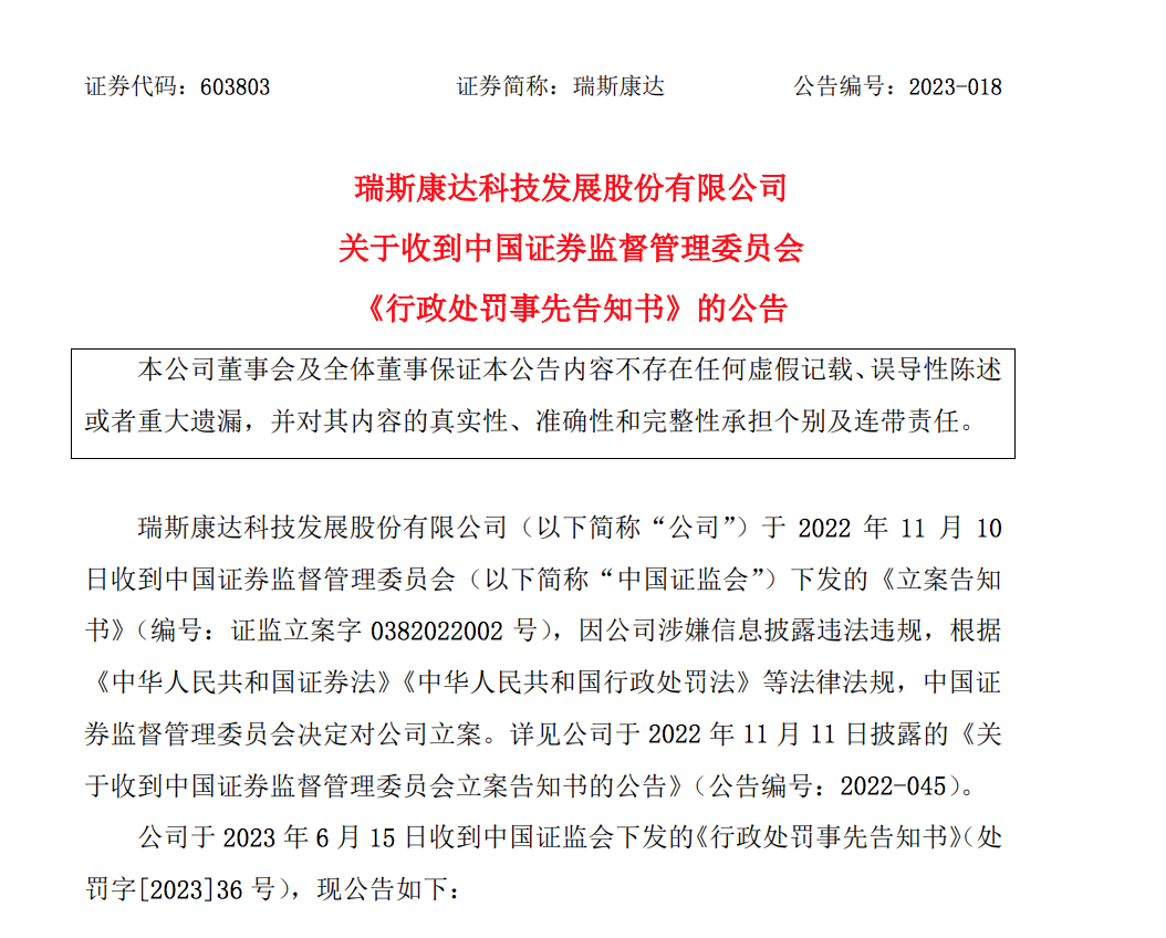6月17日,瑞斯康达科技发展股份有限公司(603803.SH,以下简称“瑞斯康达”)公告称,收到中国证监会《行政处罚事先告知书》。证监会就瑞斯康达涉嫌信息披露违法违规一案,拟对其处以200万元罚款,对公司董事、高管等8位责任人处以总计290万元罚款。