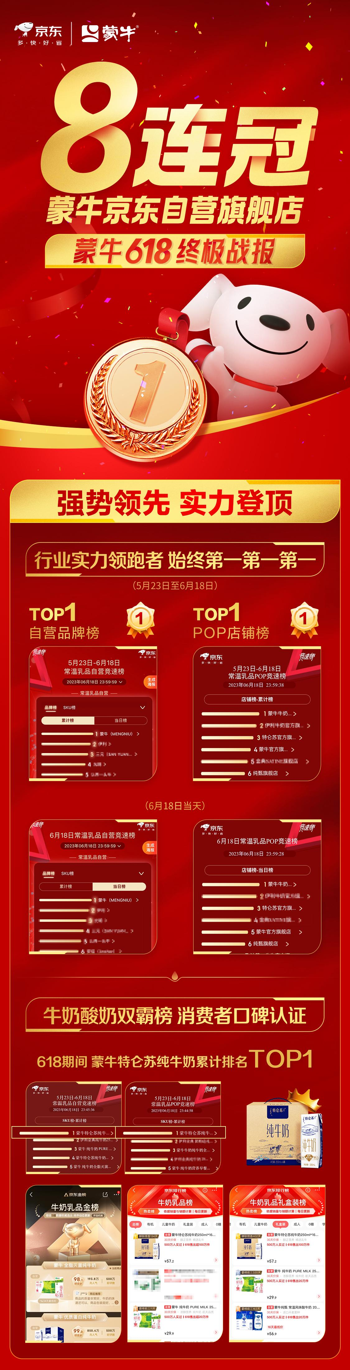 “京东618”活动期间,在竞争激烈的大促活动中,蒙牛新零售逆势破局,摘得“618”当天及“618”期间(5月23日-6月18日)常温乳制品店铺维度“双冠王”和品牌维度“双冠王”,这也是蒙牛在京东618大促中第8次摘得此项桂冠。