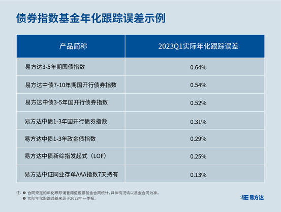 再以易方达基金旗下的债券指数基金为例,来看看具体产品的年化跟踪误差。截至2023年3月31日,易方达基金已成立7只债券指数基金,合同规定的年化跟踪误差阈值均为2%,定期报告中披露的实际年化跟踪误差均在控制范围内,最高为0.64%,最低为0.13%,平均值为0.38%。