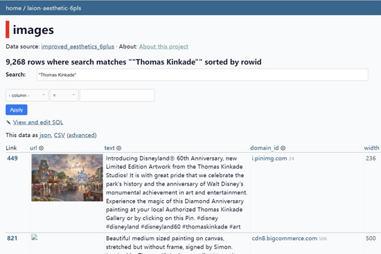 该数据库中检索“Thomas Kinkade”的结果截图。这些图像数据被用于训练Stable Diffusion。