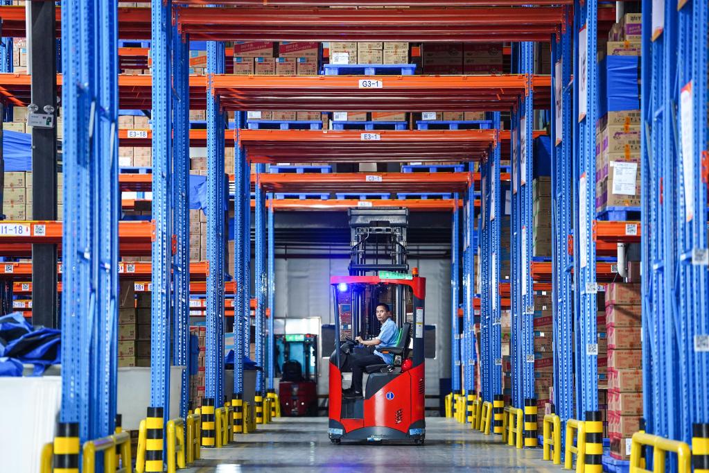6月28日,在湖南省岳阳市平江高新技术产业园,劲仔食品平江生产基地的员工在成品仓库里驾驶叉车搬运鳀鱼产品。(新华社记者陈晔华摄)