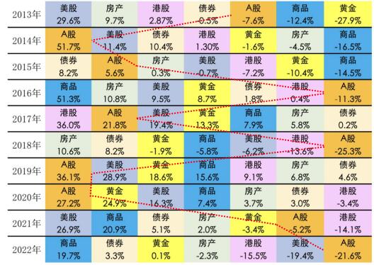 我们选取股票、债券、商品、黄金、房产以及境外股票标的(港股、美股)这几类风险收益特征各有不同、相关性较低的代表性资产进行观察,可以发现,过年10年间:一是在收益率的竞逐中没有“常胜将军”;二是同一资产在年度间的收益差距也很大(尤其是高风险资产),相对强弱也起伏明显,收益、排名的“反转”剧情不断上演,且难有规律可循。(见下图)