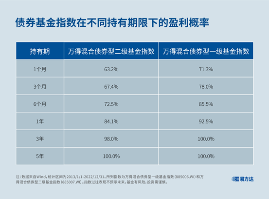 以万得混合债券型二级基金指数代表二级债基,截至2022年底,使用过去10年的历史数据测算,如果我们在任意时间买入并持有1个月,指数盈利的可能性在60%左右。