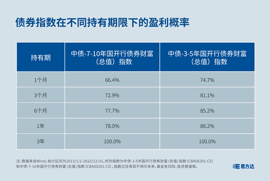 我们用中债-7-10年国开行债券财富(总值)指数和中债-3-5年国开行债券财富(总值)指数分别做测算,可以看到,两只债券指数持有1个月的盈利概率分别为66.4%和74.7%。