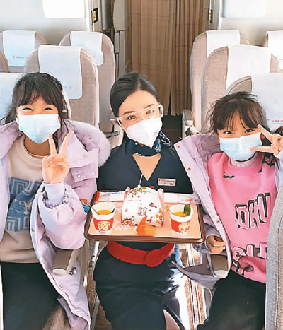 她对记者讲了一个小故事:“还记得2021年飞新加坡回上海的航班上,迎客时遇到了一位哭着上飞机的女学生,当时不知道发生了什么,大家都很心疼她,就想着怎样才能安慰她。”朱利勍回忆,起飞后,她带着班组成员利用机上资源,动手制作了一个甜品酸奶杯,用机上的折纸做了两个卡通小动物,并在卡片上写了祝福语。“当我们把这些端到那位女生面前时,她一下被我们感动了,并对我们表示了感谢。乘客的感激、笑容带给了我努力工作的动力。”