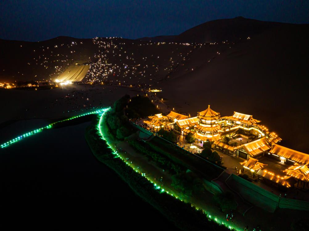 8月8日夜,游客在敦煌鸣沙山上亮起手机参加演唱会(无人机照片)。新华社记者 张可任 摄
