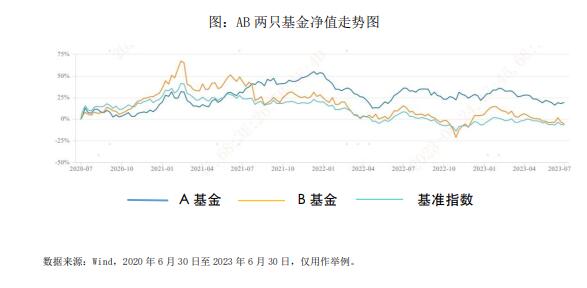 二是“看图说话”。风险水平差异较大的股票型基金,通过图线叠加对比净值走势,可大致了解不同基金的风险水平差异,这是对普通投资者而言比较方便直观的方法。比如在下图中,可以大致看出B基金的波动率与最大回撤比A基金更高。
