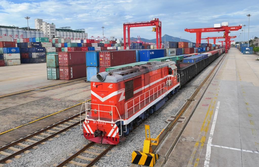 9月4日,在江苏省连云港市中哈连云港物流合作基地,一列中欧班列整装待发(无人机照片)。新华社发(王健民摄)