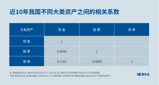 截至2023年6月30日,近10年来现金及现金等价物的波动非常小,与债券和股票的相关性都很低;而股票和债券之间的相关系数为-0.0895,呈微弱的负相关。