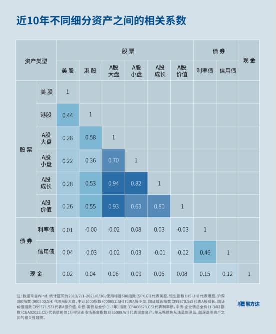大类资产还可以进一步细分。如股票可以按照市值和风格分成大/中/小盘、成长/价值等,也可以按国别地域分成美股、港股、A股等;债券可以分为利率债、信用债等等。这些细分资产之间的相关性如何呢?