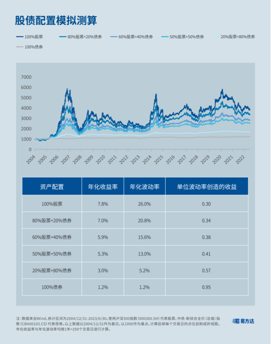我们用沪深300指数代表股票,中债-新综合全价(总值)指数代表债券,模拟在2004年12月31日-2023年6月30日期间,股债配比分别为20/80、50/50、60/40、80/20四个组合的表现。