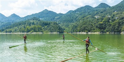为更好依托当地良好的山水资源发展全域旅游,湖北省恩施土家族苗族自治州宣恩县引进民间体育项目“独竹漂”。图为九月十五日,水上运动爱好者在该县双龙湖上练习。王法钧摄(新华社发)