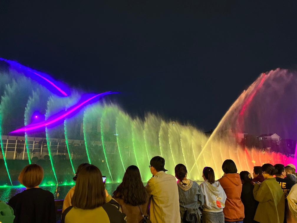 游客在凤凰幻城观看水幕光影秀。新华社记者任玮 摄