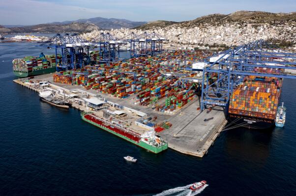 图为2022年2月19日拍摄的希腊比雷埃夫斯港集装箱3号码头(无人机照片)。作为“一带一路”倡议的典范项目,希腊比雷埃夫斯港年货物吞吐量增至500万标箱以上,跃升为欧洲第四大集装箱港口、地中海领先集装箱大港。新华社发(中远海运港口比雷埃夫斯码头有限公司供图)
