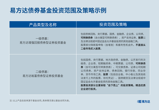 以易方达基金的两只产品为例,我们来看看一级债基和二级债基的投资范围和权益投资策略有何不同。