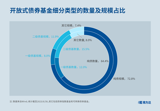 根据Wind数据,截至2023年6月30日,市场上一、二级债基产品的数量合计约900只,占开放式债券基金总数的比例近30%,产品规模约1.6万亿元。