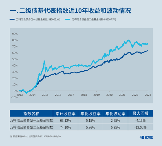 由于参与权益资产投资的方式不同,一、二级债基呈现不同的风险收益特征。我们用万得混合债券型一级基金指数和万得混合债券型二级基金指数分别代表一、二级债基,回顾其近10年的历史表现。