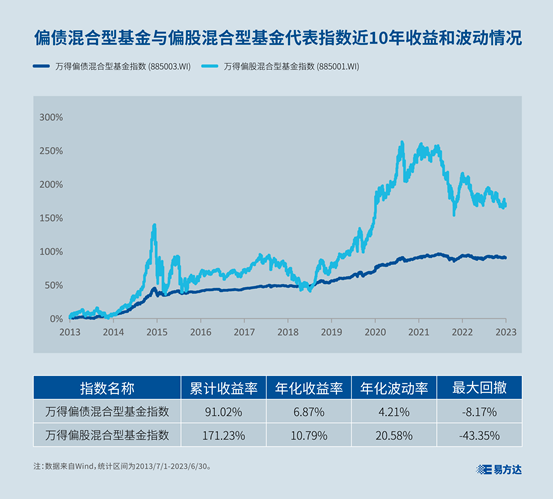 我们用万得偏债混合型基金指数和万得偏股混合型基金指数分别代表偏债混合型基金和偏股混合型基金,回顾近10年的历史表现。