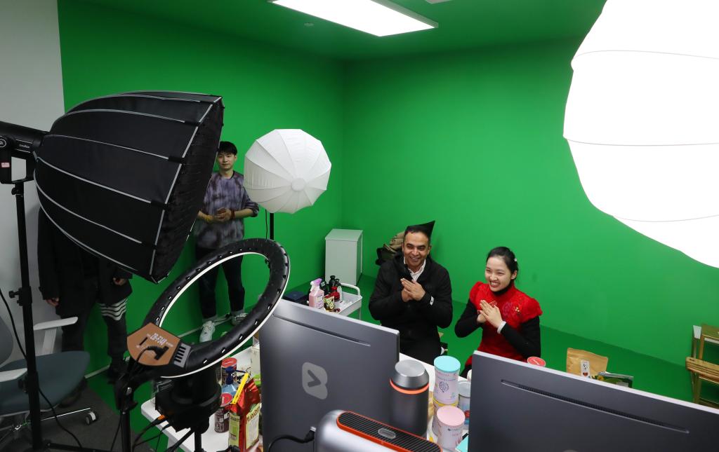 来自巴基斯坦的商人李龙(右二)在虹桥品汇的直播间内直播。新华社记者方喆 摄