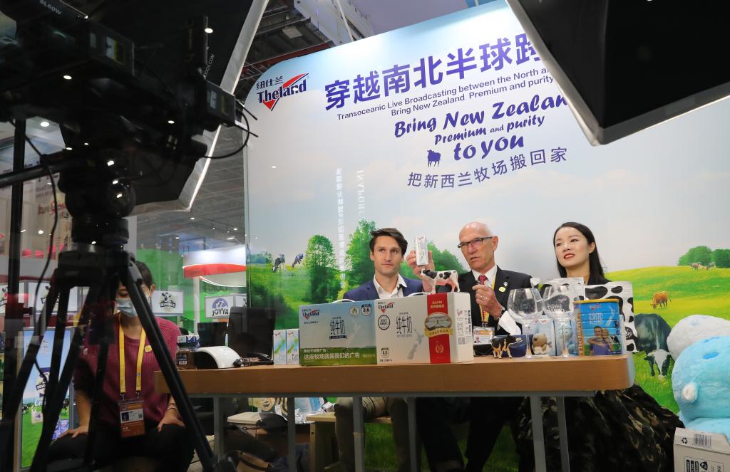新西兰纽仕兰乳业有限公司执行总裁罗伊·范登克(中)在第三届进博会展台上搭建的网络直播间出镜带货。新华社记者方喆 摄