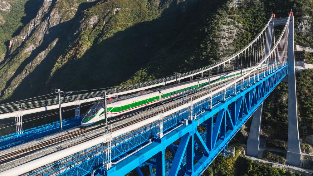 图为11月9日,丽香铁路动态检测期间,复兴号列车驶过虎跳峡金沙江铁路大桥。(中国铁路昆明局集团公司供图)