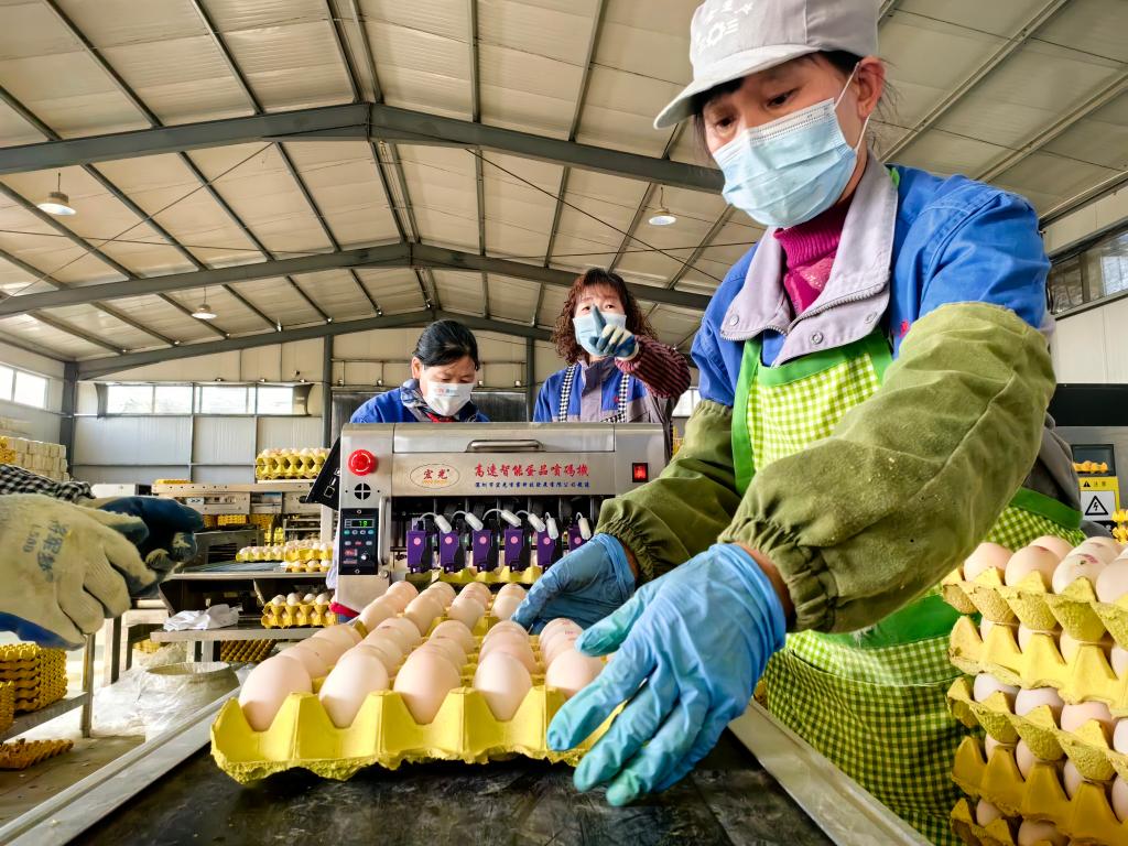 在三里镇乔村,陕西得康生态农业科技有限公司的智能化生产车间,一枚枚新鲜的鸡蛋通过传送带从鸡舍自动运送到包装车间。车间里,58岁的村民李小利只需挑选出破损的鸡蛋,再将鸡蛋摆放整齐即可,每月可收入约3000元。