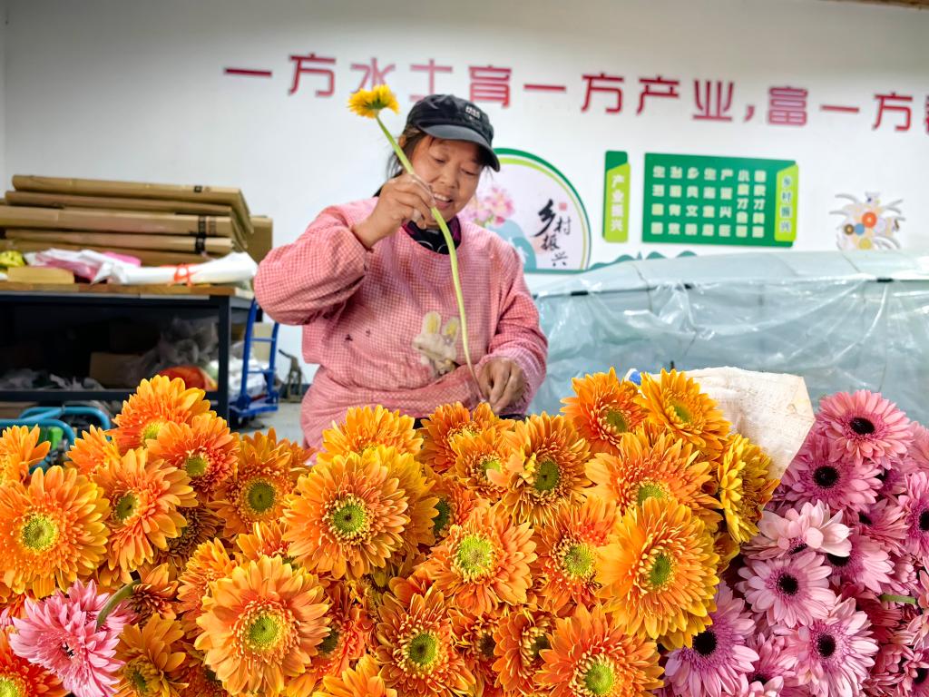 村民在蓝田县三里镇一家花卉产业园整理鲜花。新华社记者 张斌 摄